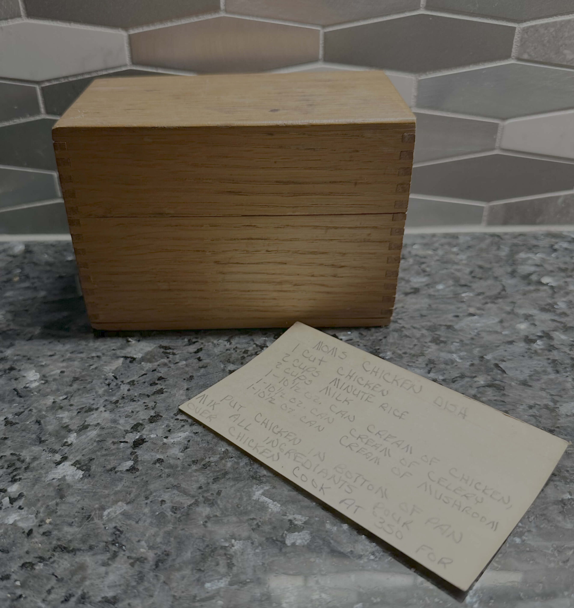 Picture of a wood recipe box with a recipe card balanced on the top with the words: Mom's Chicken Dish - 1 cut chicken, 2 cups minute rice, 2 cups mils, 1 10.5 ox can cream of chicken, 1 10.5 oz can cream of celery, 1 10.5 oz can cream of mushroom. Put chicken in bottom of pan, mix all ingredients.
